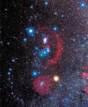 If you follow the line from Alpha and Beta Centauri to the Southern Cross and then continue along the galactic plane about the same distance, you'll come to 5th-magnitude Eta Carinae. In 1843, Eta Carinae had an outburst that made it the second-brightest star in the night sky. The eruption threw off most of a large nebula surrounding the star. This star is brightening again (see "Scoping Out the Monster Star," February 2000). The chance to witness an outburst makes any time you invest in monitoring the star worthwhile. The nebula around Eta Carinae is roughly 2° across (about four times the apparent diameter of the moon) and an easy naked-eye object that doesn't require skies as dark as those needed to see the North America Nebula in Cygnus the Swan. Like the North America Nebula, the Eta Carinae Nebula looks like it does in wide-field photos. The only difference is that the eye sees a ghostly white and not the garish red that film brings out.